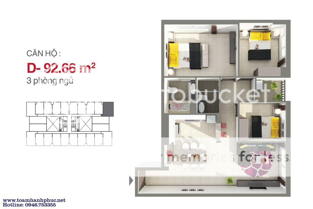 - Căn hộ loại D = 92.66 m2 – 3 Phòng ngủ, 2WC